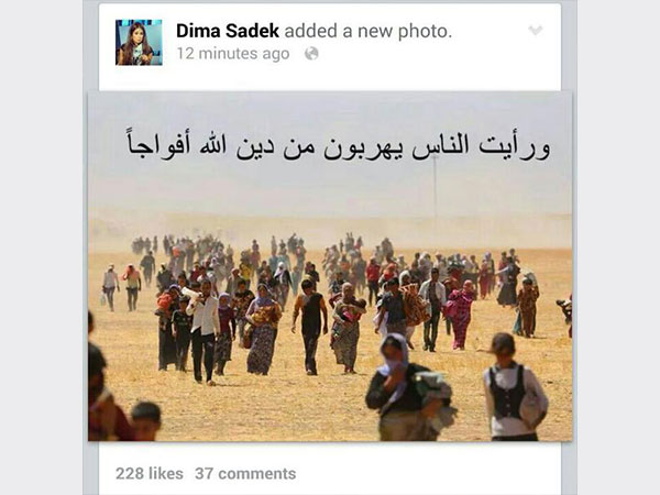 جاء هذا الاتهام بعد نشر ديما صورة، كتب عليها «ورأيت الناس يهربون من دين الله أفواجا»، بدلا من «ورأيت الناس يدخلون في دين الله أفواجا»، وذلك في إشارة منها لما يسببه تنظيم «داعش» من تنفير الناس من الدين الإسلامي.