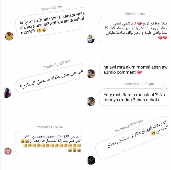 جمهور مي عاتبوها لعدم تقديمها مسلسل في شهر رمضان هذا العام، وهو ما دفعها لتوجيه اعتذار خاص لهم، بقولها: "انا آسفة جدا والله انا بعتذر لكم لتاني مرة وبوعدكم بإذن الله نكون مع بعض رمضان القادم إن شاء الله".